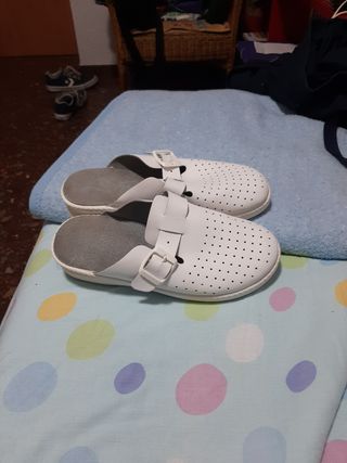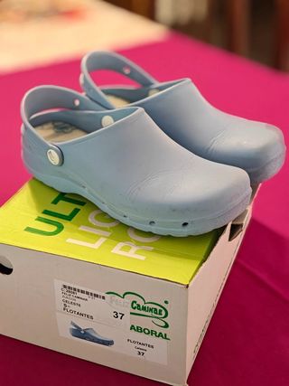 Zuecos de trabajo color celeste, buen estado, talla 37. Marca Feliz Caminar. Poco uso, muy cómodos.