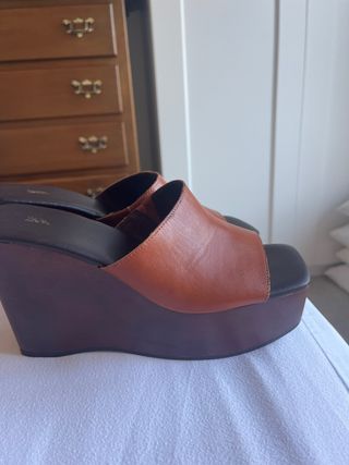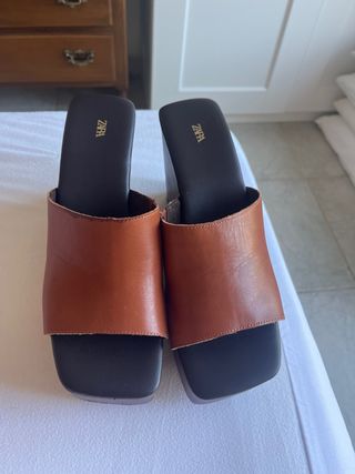 Zuecos de plataforma de Zara en color marrón. Un diseño moderno y cómodo. - Pala de cuero. - Punta cuadrada. - Plataforma de madera.
