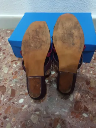 Elegantes y auténticas babuchas de estilo árabe ( compradas en el zoco de Marrakech) con un diseño trenzado y multicolor. - Tiras de cuero en varios tonos. - Detalle anudado en la pala. - Punta fina. - Suela y plantilla también de piel. - Tacón grueso de 2cm. ESTAN USADAS PERO EN PERFECTAS CONDICIONES. NO TIENE DEFECTOS!!!