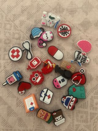 Adorno para zapatos Crocs con temática médica. ¡Son ideales para darle un toque divertido y original a tus Crocs! - Incluye encantos de diferentes diseños relacionados con la medicina, pesadilla antes de navidad y de las emociones - Los charms son de colores variados y alegres. - Están sin utilizar. - El precio es de dos unidades por un euro, se venden por separado