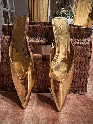 Elegantes mules de Zara con un llamativo acabado dorado. - Diseño puntiagudo. - Tacón fino.