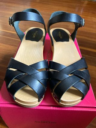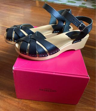 Preciosos zuecos de la marca Swedish Hasbeens. Son de color negro y talla 37. - Diseño entrelazado. - Material de cuero. - Tacón de madera.