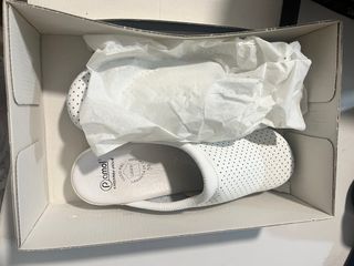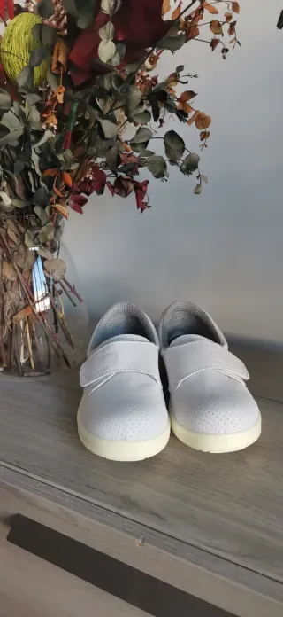 Sólo me los he puesto en una jornada de trabajo (es un 38, pero me quedan grandes, es como un número 39) Zapato de trabajo en piel sintética blanca. Empeine perforado, ayuda a la transpiración. Collarín acolchado para mejor confort. Cierre con velcro ajustable. Plantilla interior extraíble, antibacteriana. Puntera reforzada.