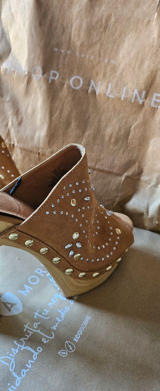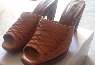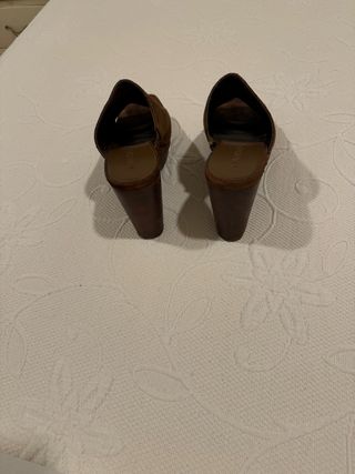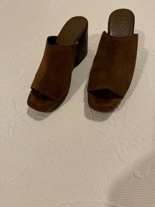 Zuecos abiertos Mango, color coñac, numero 39, abiertos por delante, tacon 10cm, plataforma 3vm. Plataforma y tacon en madera. Perfecto edrafo,