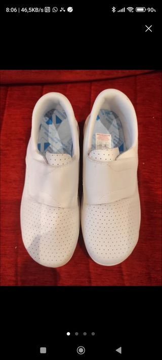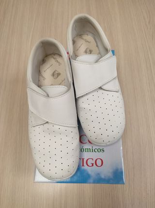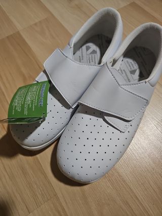 Se venden zapatos sanitarios de la marca Percla, en color blanco y talla 36. - Diseño slip-on con cierre de velcro. - Perforaciones para mayor transpiración. - Plantillas con tratamiento antimicrobiano. - Ideales para profesionales de la salud.