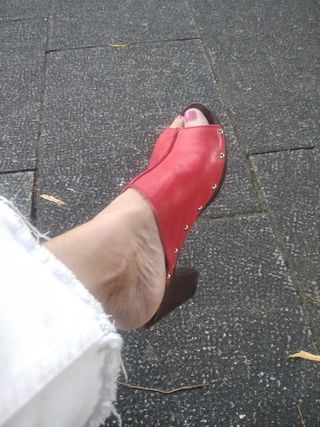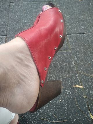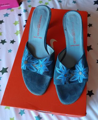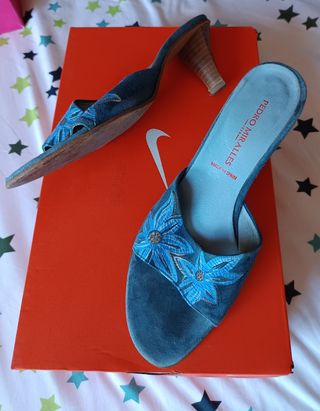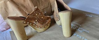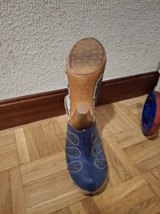 Elegantes sandalias de tacón alto con plataforma. Zapato azul, muy cómodos. * No llegan a 5 usos Zueco marrón nuevos. 25€ pares sueltos. Juntos 60€