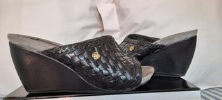 Zuecos en piel trenzada de color negro y borde gris. Altura de la cuña es de 8 cm. Se encuentran en buen estado. Van en su propia caja.
