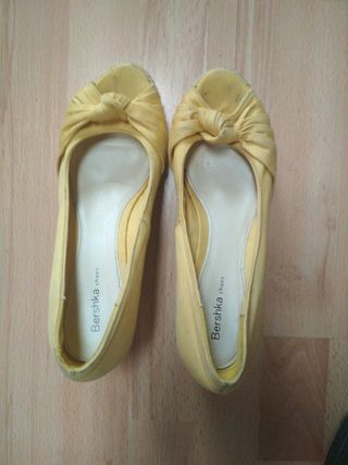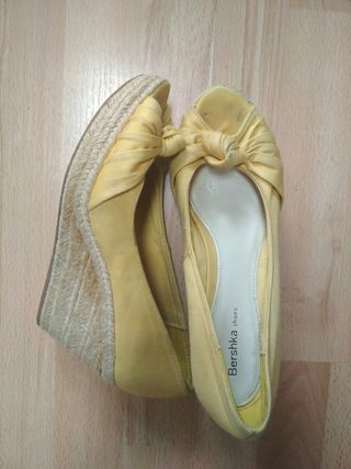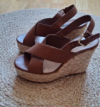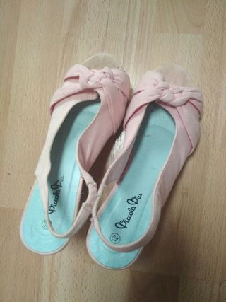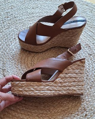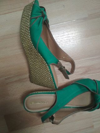 Preciosas cuñas de la marca Pull and Bear. Muy comodas, altura cuña por detras de 11 cm. Ideales para cualquier ocasión. Talla 37. En perfecto estado, salvo unos roces en la piel, como se aprecia en la foto.