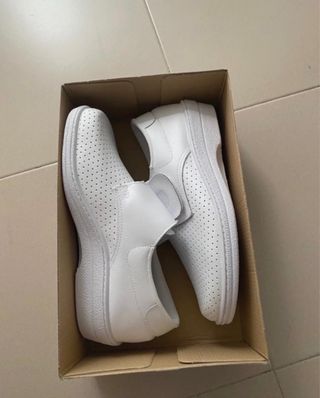 Zapatos negros sin cordones, ideales para hostelería. Codeor - Diseño cómodo y funcional. - Material resistente. Talla 37 (yo uso la 38 de normal y son los que he usado) Calzado ligero, flexible, lavable y de mucha duración. Piso antideslizante. Horma Unisex, facilita el apoyo del pie sin comprimirlo. El quiebre de horma permite un reparto equilibrado del peso del cuerpo