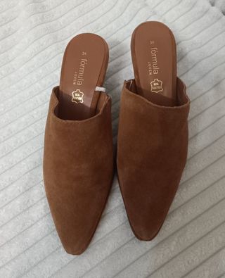 Preciosos zuecos de ante de Fórmula Joven, talla 36. Son de color marrón y tienen un diseño elegante y sofisticado. - Material: Ante. - Estilo: Zuecos de tacón bajo. - Punta: En punta.