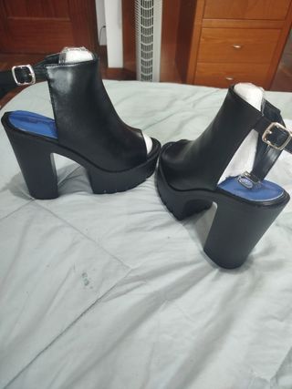 Preciosos zuecos de plataforma y tacón alto, completamente nuevos a estrenar. Son de color negro y tienen un diseño elegante. - Tacón grueso y cómodo. - Estilo peep-toe. - Hebilla de cierre en el tobillo. - Material: Sintético de aspecto piel.