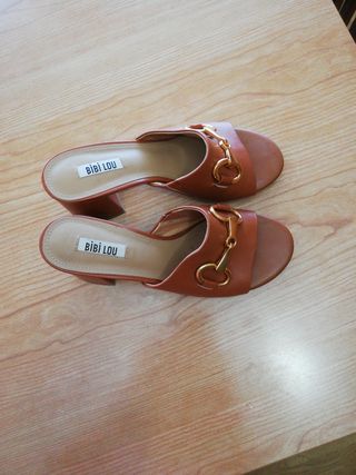 Preciosos zuecos de tacón de la marca BIBI LOU. Son de color marrón y tienen un diseño elegante y sofisticado. - Tacón bloque. - Hebillas doradas.