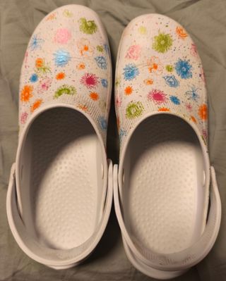Zuecos sanitarios con un alegre estampado floral multicolor. Son cómodos y perfectos para el trabajo o el día a día. - Diseño con flores vibrantes. - Material ligero y fácil de limpiar.