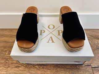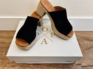 Zuecos de cuña con plataforma de la marca POPA. - Material exterior de ante. - Plataforma y cuña forradas de esparto. - Color negro en la pala y suela de yute. *UN SOLO USO*