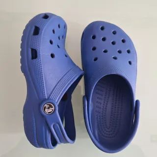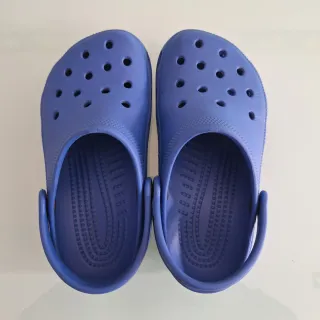 Zuecos Crocs en color azul, talla 46. Perfectos para el día a día. - Diseño clásico con suela blanca. - Incluye varios Jibbit por cambio a barefoot
