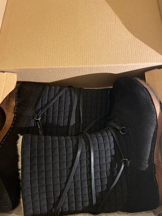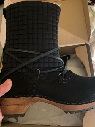 Botas estilo zueco de la marca Sanitas. - Exterior de tela - Detalle acolchado. - Forro interior de borrego - Suela de madera.