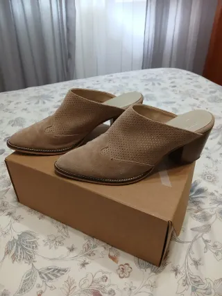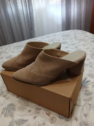 Zuecos de señora en color beige y marrón, con un diseño moderno y elegante. Han sido usados muy pocas veces. - Material exterior de ante. - Detalle de perforaciones. - Tacón cuadrado.