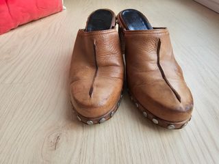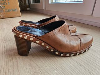 Estupendos zuecos de piel española. Estado bueno. Talla 37 de España. Usados 4 veces, pero me quedan pequeños. Tiene tachuelas de metal de plata como adornos. Ver medidas de la plantilla en las fotos. ¿Te la vas a perder? Dale una nueva vida. En mi perfil hay cosas muy bonitas. Feliz primavera sostenible. Feliz primavera sostenible. #moda#, #sostenible#, #altacalidad#, #fashion#, #natural#, #diseño#, 💎#carolinaherrera#, #purificacióngarcia#, #tous#, #loewe#, #prada#, #guess#, #dior#, #zara#, #adolfodominguez#, #gucci#, #bershka - Diseño tipo mule. - Tacón grueso de madera. - Detalle de tachuelas alrededor de la suela y el talón.