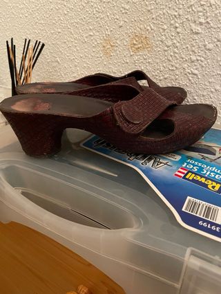 Zuecos de piel legítima con plataforma. Cierre en hebilla. Muy comodos.