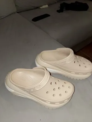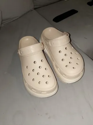 Calzado tipo zueco de la marca Crocs en color beige. - Diseño clásico con orificios. - Suela gruesa y cómoda.