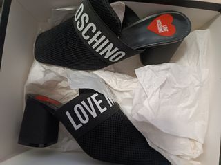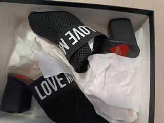Mules Love Moschino negro con banda logo LOVE Moschino + corazón rojo - Talla 37EU. - Nuevo a estrenar y en su caja original (la caja está algo magullada/desgastada)