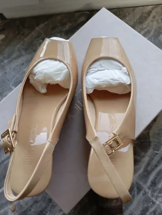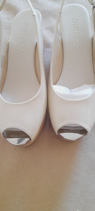 Elegantes cuñas de la marca Jimmy Choo en color beige. - Diseño de cuña con plataforma. - Tira ajustable en el tobillo. - Acabado brillante.
