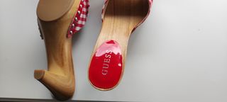 Preciosas sandalias Guess en cuadros Vichy rojos, sin estrenar, número 39, tacón de 10cms y plataforma de 2,5 cms. Su precio en tienda fue de 120€, las vendo por 40 completamente nuevas con su caja.