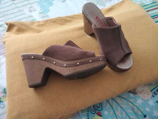 Zuecos de ante en color marrón. Tienen un diseño cómodo y moderno, perfectos para el día a día. - Material exterior de ante. - Detalle de hebilla dorada. - Suela con acabado imitación corcho. - Usados 2 veces