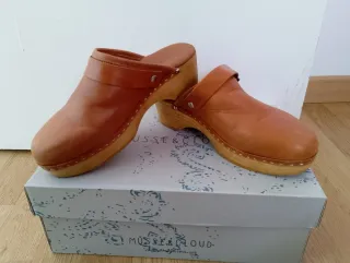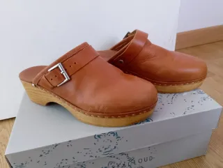 Solo se han usado una vez. Hechos en España. Zuecos de cuero con un diseño clásico y atemporal. - Material exterior de cuero. - Detalle de hebilla metálica ajustable. - Suela de madera. - Correa trasera para mayor sujeción.