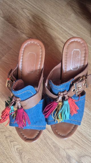 Zuecos madera de tela e interior piel. Aunque pone 38 da talla 37. Casi sin uso.