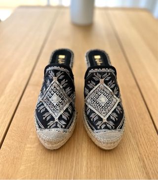 100% piel. Pala también de piel con abalorios e hilo dorado. Son muy cómodos porque el diseño que tienen recoge muy bien el pie y no cuesta nada andar con ellos como puede ocurrir con otras mulés. Las tapas son nuevas. El tipo de zapato permite llevarlo con vaqueros y también en eventos por su diseño. Me los he puesto en dos bodas.