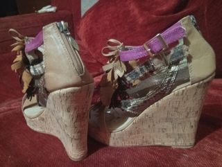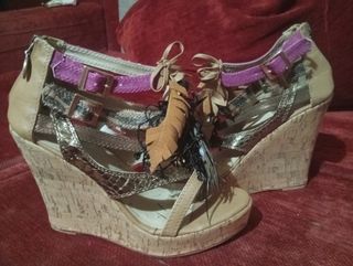 Preciosos zuecos de cuña, estilo boho chic. Ideales para verano. Son de color beige con detalles multicolor. - Diseño de tiras entrecruzadas. - Detalle de plumas. - Suela de corcho. - Cierre de cremallera.
