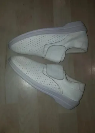 Zapatos de seguridad, zuecos blancos de trabajo. Cómodos y prácticos. Suela antideslizante. Talla 38. Tienen unos 3cm de tacón. Cierre con velcro ajustable. Muy buen estado. Son unisex, para hombre o mujer. Diseño perforado para mayor transpiración. Polipiel de muy buena calidad. 10€ WhatsApp 633846169. Hago envíos