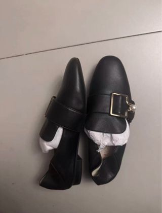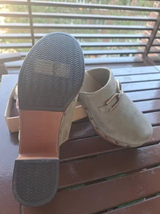Zuecos de ante, de Bershka. Son la talla 39. Tienen hebilla a un lado y tachuelas doradas de adorno. Son de color marrón claro, arena, como en la primera foto (las otras fotos llevan flash). El zueco derecho tiene una imperfección de fábrica, se aprecia en las fotos, pero no se nota mucho, de ahí su precio. Costaron 25,99€. Están sin usar, con su etiqueta. ENVÍOS POR WALLAPOP O RECOGIDA EN PLAZA CASTILLA.
