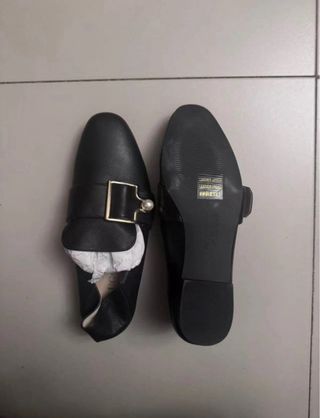 Zuecos negros elegantes con detalle de hebilla dorada y perla. - Diseño tipo mocasín. - Hebilla metálica dorada. - Adorno de perla. - Suela de goma.