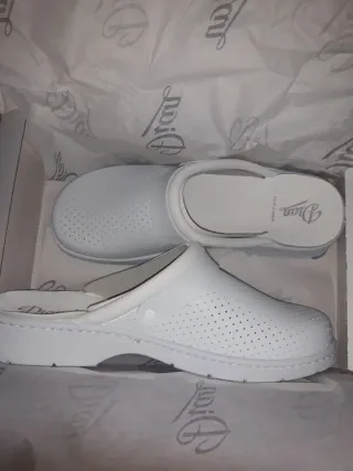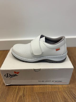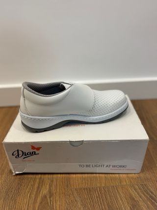 Zuecos profesionales de la marca Dian, modelo 1807 LM. VARIAS UNIDADES 9 TALLA 38 2 TALLA 40 - Color blanco. - Diseño con perforaciones. - Cierre de banda. - Suela antideslizante.