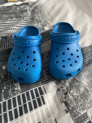 Zuecos Crocs en color azul, talla 36. Se encuentran en excelente estado, como nuevos. - Diseño clásico y cómodo. - Material Croslite™. - Orificios para ventilación y personalización con Jibbitz™.