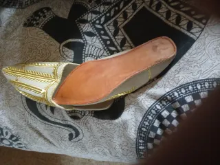 Elegantes babuchas de estilo árabe con un diseño intrincado. - Adornadas con bordados dorados. - Acabado exterior en beige. - Interior forrado para mayor comodidad.