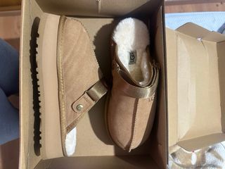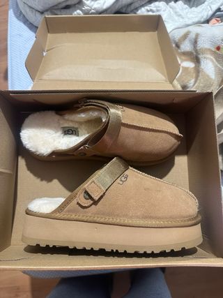 Zuecos Ugg Goldenstar en color marrón. Perfectos para estar cómodo en casa o para un look casual. - Diseño abierto en el talón. - Forro interior de pelo sintético. - Correa ajustable en el empeine. - Suela gruesa y resistente.
