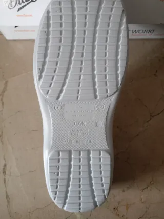 zuecos sanitarios blancos de la marca Dian, diseñados específicamente para entornos profesionales como hospitales, clínicas o cocinas. Material: Fabricados en EVA (etilvinilacetato), lo que los hace ultraligeros (pesan menos de 190 gramos) y fáciles de limpiar. Diseño: Son monocasco y anatómicos, con una correa posterior abatible que permite sujetar el talón o llevarlos como zuecos abiertos. Seguridad: Cuentan con suelas antideslizantes sin estrenar y en caja original