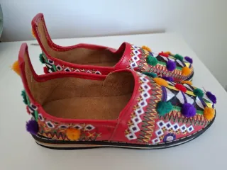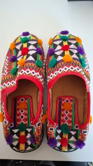 Bonitas babuchas de estilo bereber marroquí, adornadas con pompones de colores. - Diseño tradicional. - Adornos de pompones. - Acabado en piel.