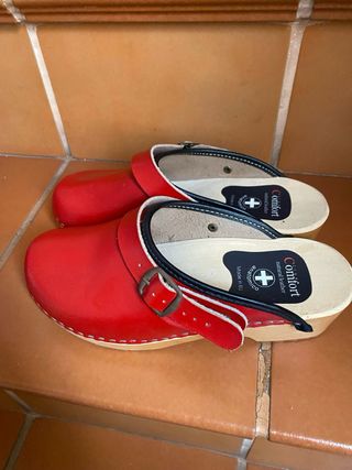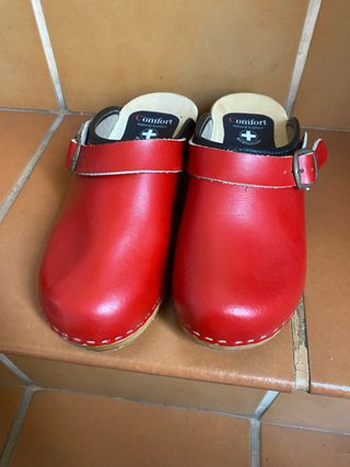 Zuecos de cuero rojo con suela de madera anatómica. - Diseño anatómico para mayor comodidad. - Correa ajustable con hebilla. - Material exterior de cuero natural.