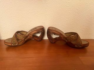Zuecos artesanales de madera con corazon labrado. puestos una vez. talla 37
