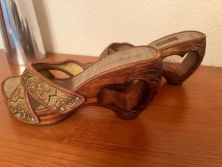 Sandalias tipo zueco de piel, color marrón. Son sandalias de tacón de madera. Están usadas, pero en buen estado. - Hechas de piel. - Diseño de zueco. - Tacón de madera. De Amparo Bernus