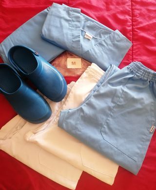 LEER: ES UN LOTE, NO SEPARO. Pijama sanitario azul talla M a ESTRENAR y ZUECOS, T. 39 en perfecto estado. + 3 pantalones, 2 blancos (usados, pero en buen estado) y 1 azul nuevo pero presenta una decoloración en la parte inferior del pantalón). SE RUEGA SERIEDAD. NO ADMITO DEVOLUCIONES.