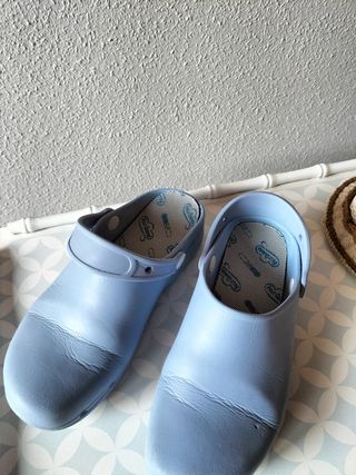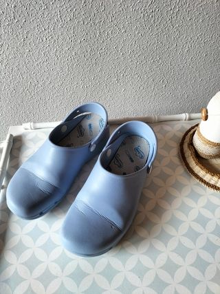 Zuecos color celeste de la marca FELIZ CAMINAR. Con sus plantillas originales. Se pueden quitar si te resulta más cómodo. El izquierdo tiene un pequeño desperfecto que se aprecia en las fotos Las suelas descoloridas de los productos de limpieza del suelo, como la lejia. Trabilla para poder sujetar el pie por detrás o subirla delante y que quede la parte posterior abierta.