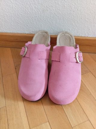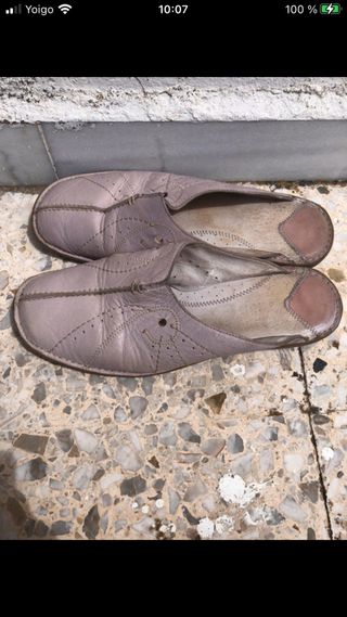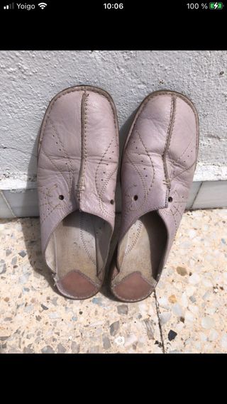 Zuecos color lila de piel por fuera y por dentro . Suela de goma . En buen estado