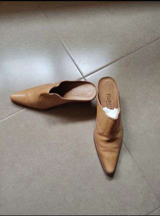 Preciosos zapatos de tacón rosa, estilo mules, con un diseño elegante y sutil. Son de cuero y presentan un ligero desgaste por el uso. - Zapatos de tacón. - Diseño de mules (sin talón). - Talla: (A determinar) - Material: Cuero.