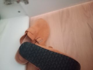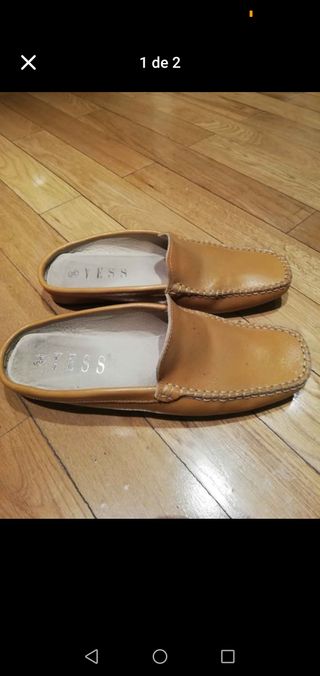 Vendo tres pares de zapatos tipo zueco. . Un par es de color blanco y el otro beige y el otro marrón con tonos brillantes. Los zapatos blancos son tipo zapatilla, con un diseño sencillo y elegante. Los zapatos beige y marrón tienen un diseño más sofisticado, con detalles bordados. Ambos pares están en buen estado. 2€ cada par.