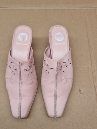 Preciosos zuecos de la marca Romena en color rosa y talla 36. Tacón bajo (5cm) muy cómodo para el dia a dia. Tienen un diseño elegante y delicado, el cual incluye unas pequeñas aberturas, calados, con forma de hojas. Usados varias veces, con algúna rozadura en tacón, pero resto en perfecto estado.